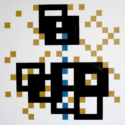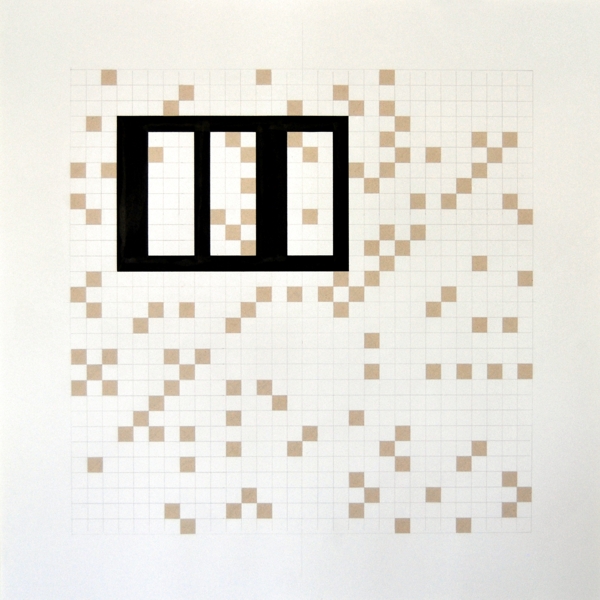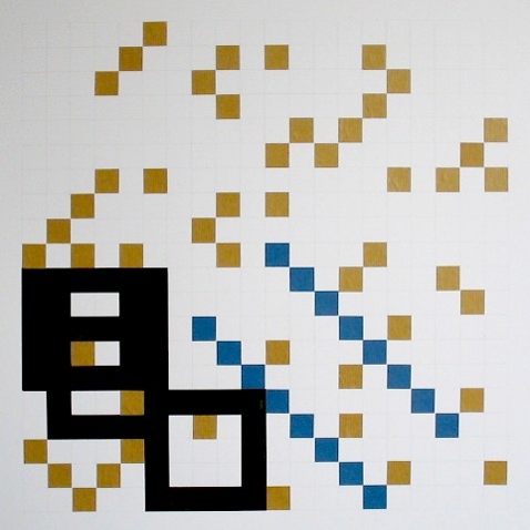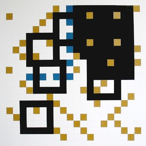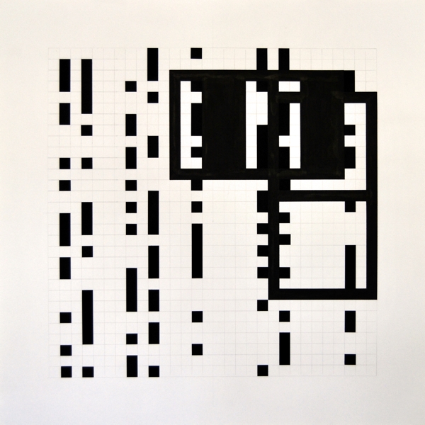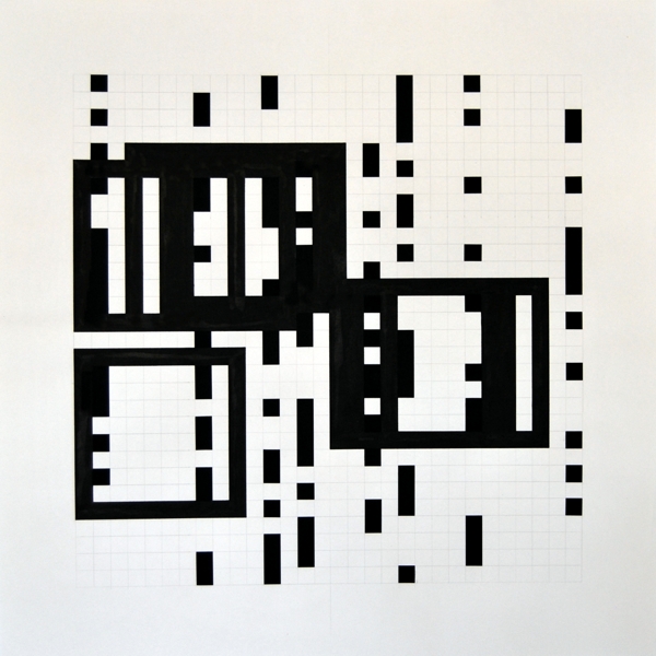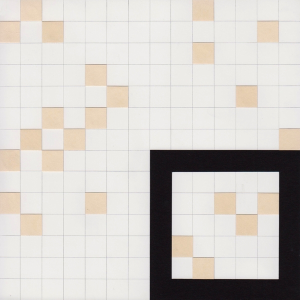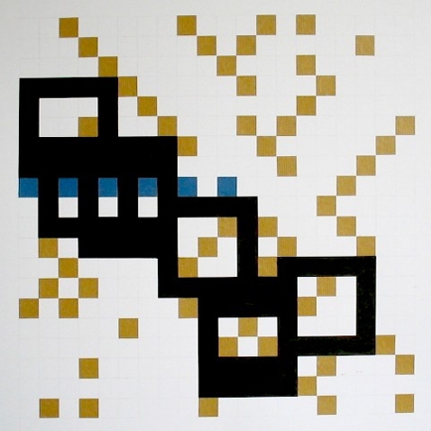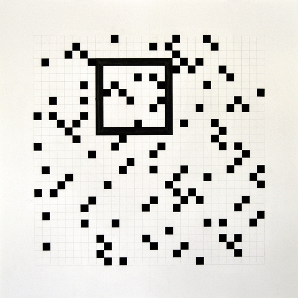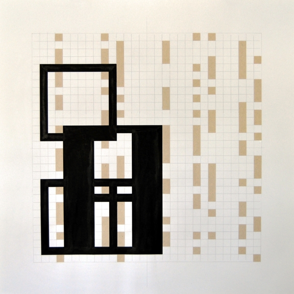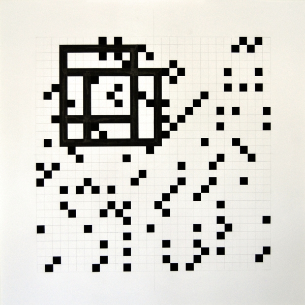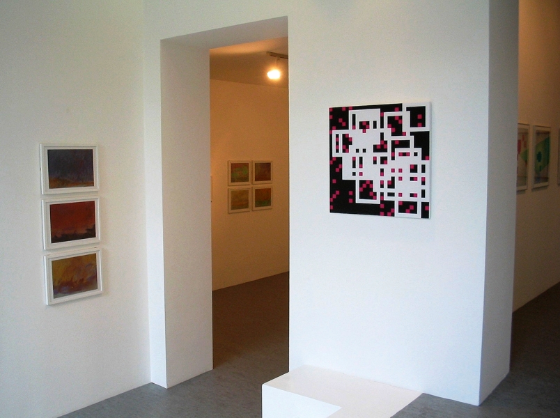 Zeichnung, Collage und Tusche auf Papier, 50 x 50cm, 14 Arbeiten 2003 und weitere Arbeiten als Graphik, Tintendruck auf Leinwand und als Postkarte.