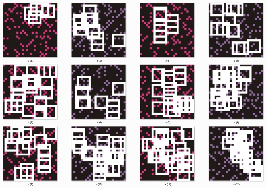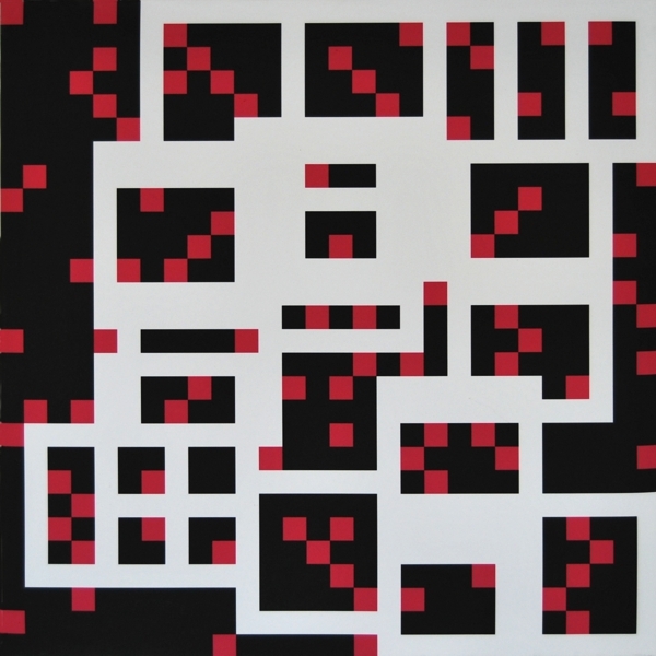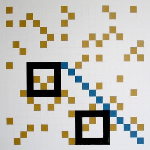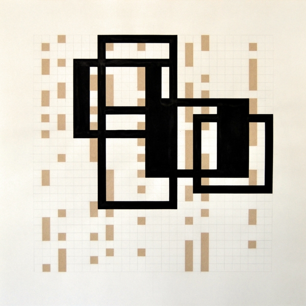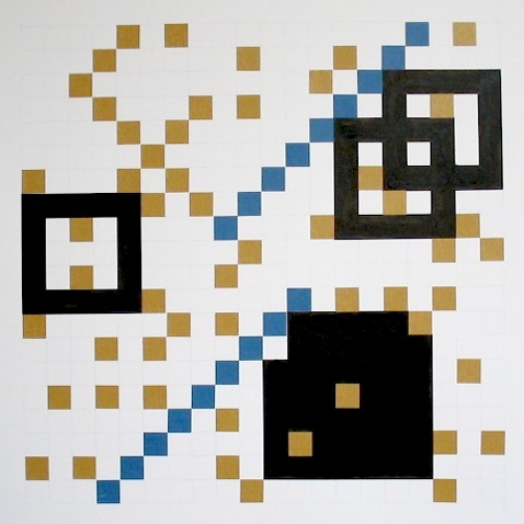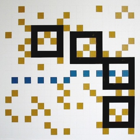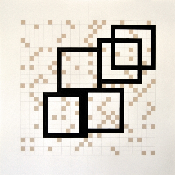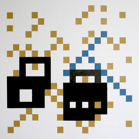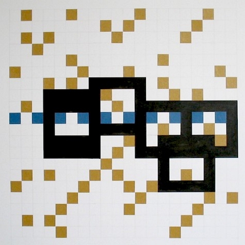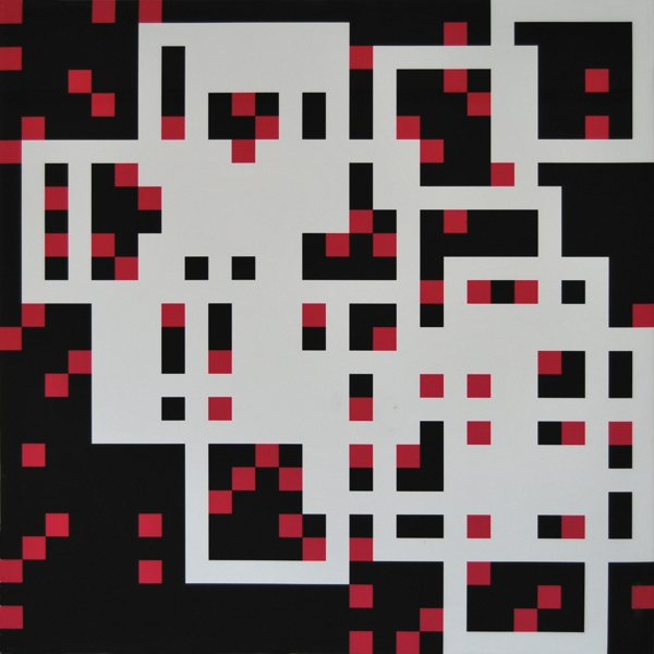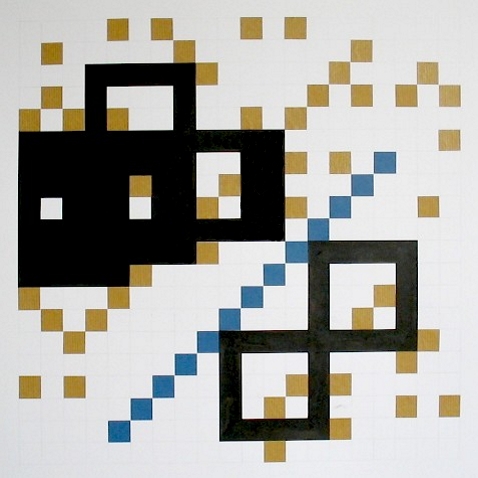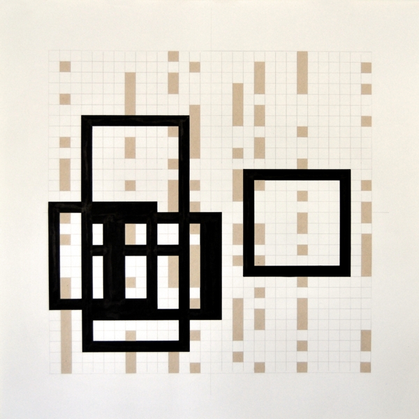 Zeichnung, Collage und Tusche auf Papier, 50 x 50cm, 14 Arbeiten 2003 und weitere Arbeiten als Graphik, Tintendruck auf Leinwand und als Postkarte.