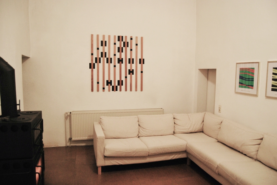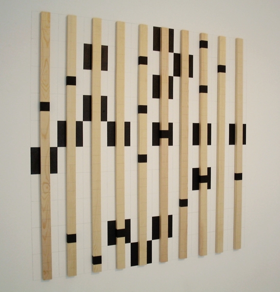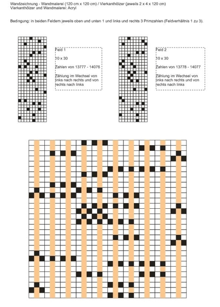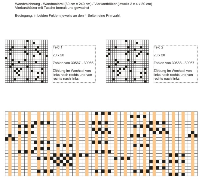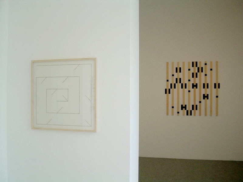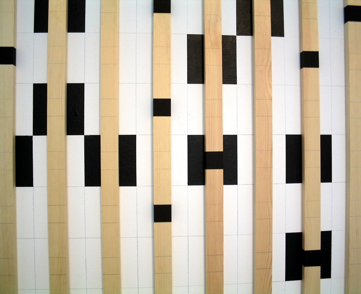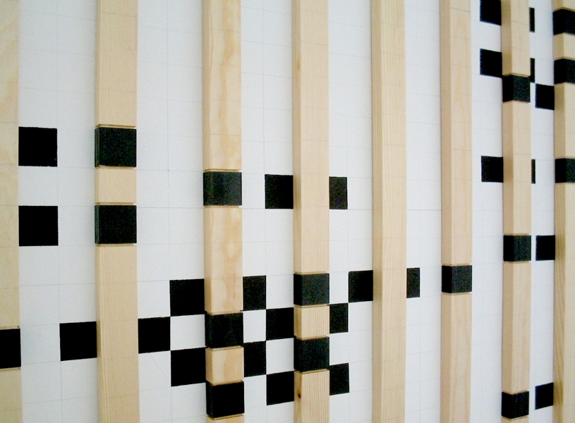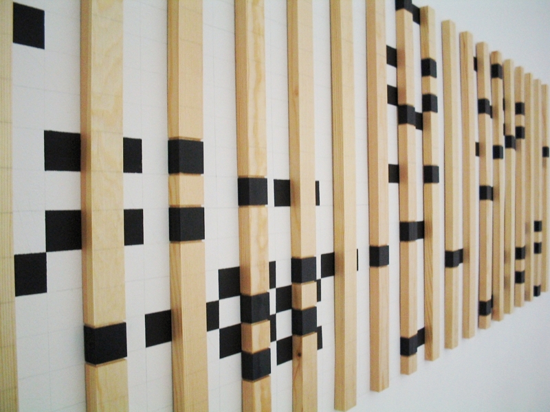 Installation (Wandzeichnung und -malerei, Holzlatten teilweise bemalt, 100 x 100 cm),