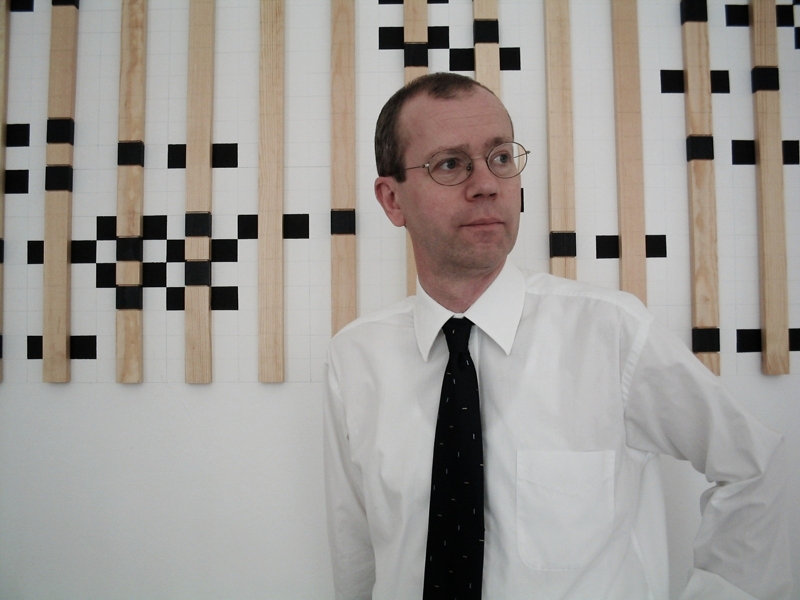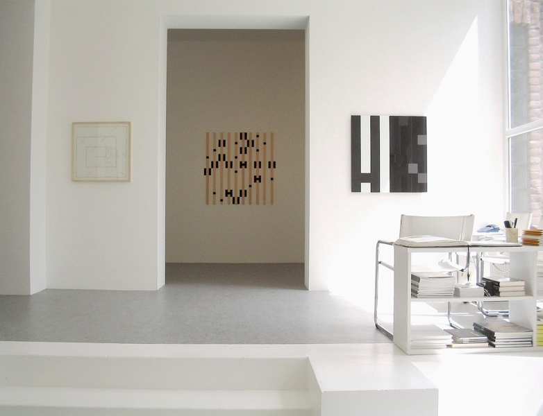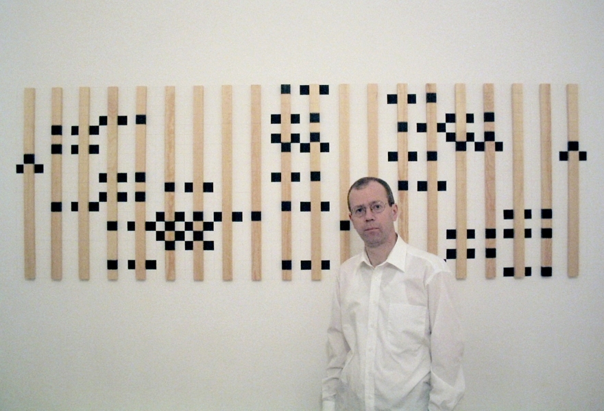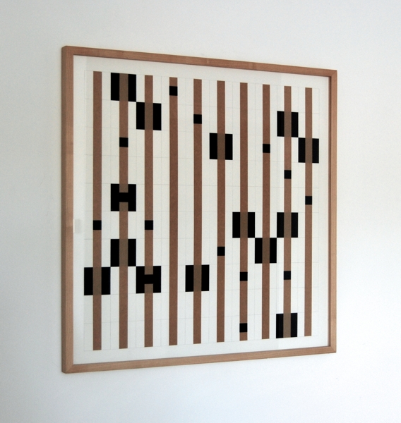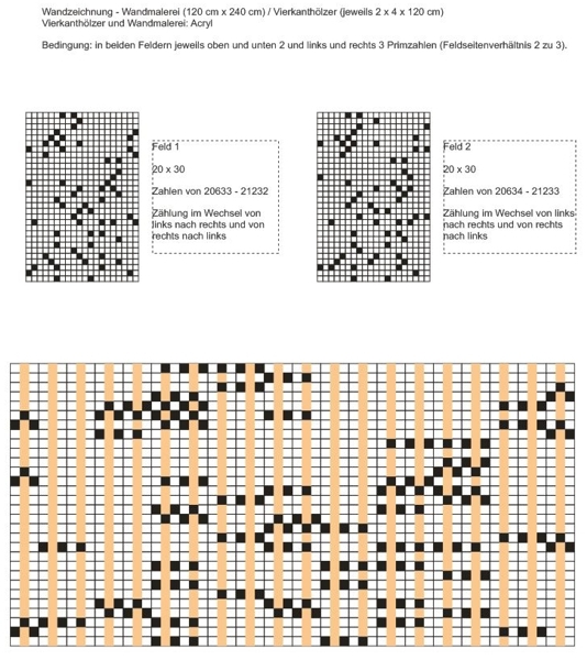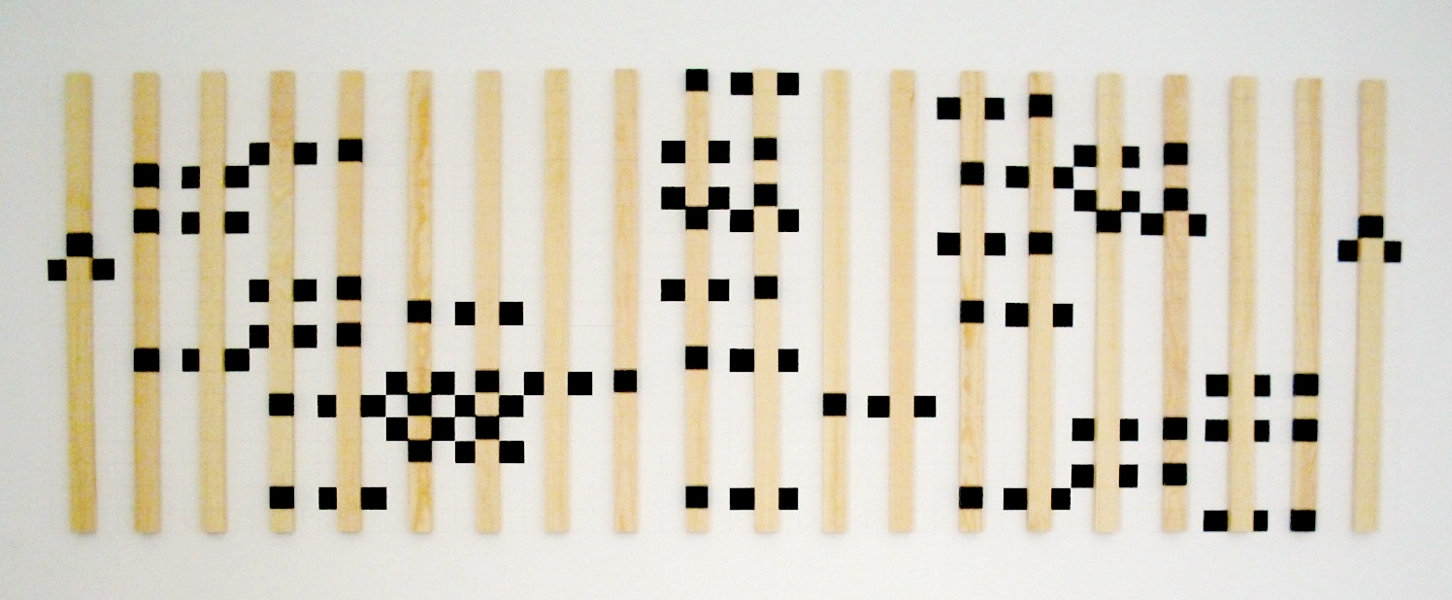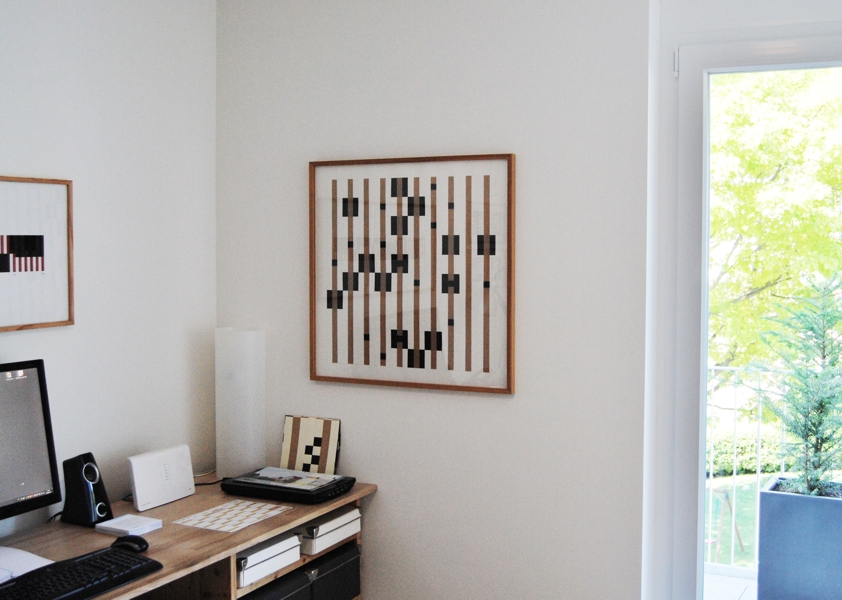 Installation (Wandzeichnung und -malerei, Holzlatten teilweise bemalt, 100 x 100 cm),