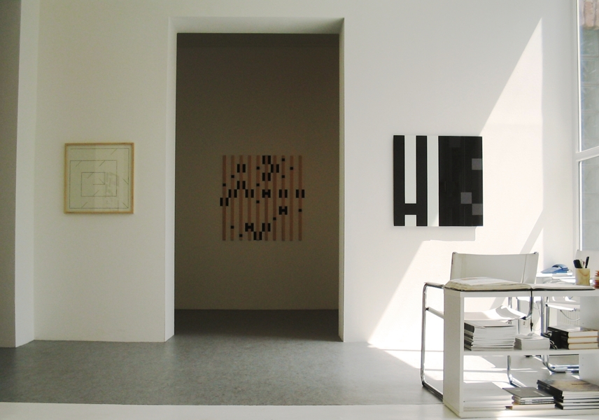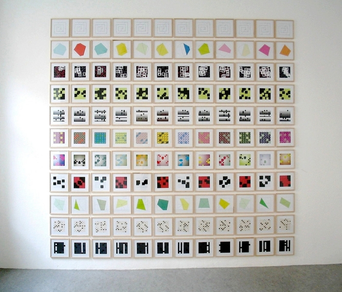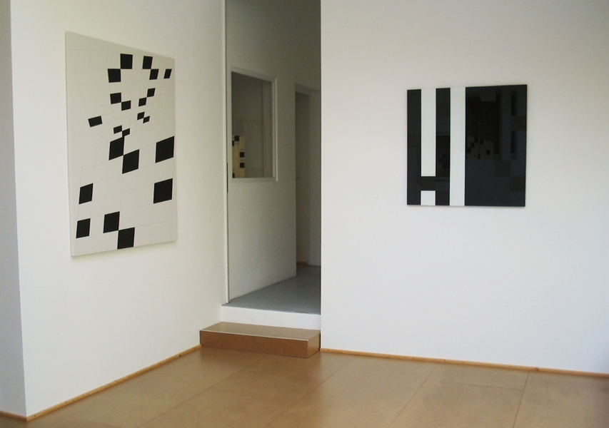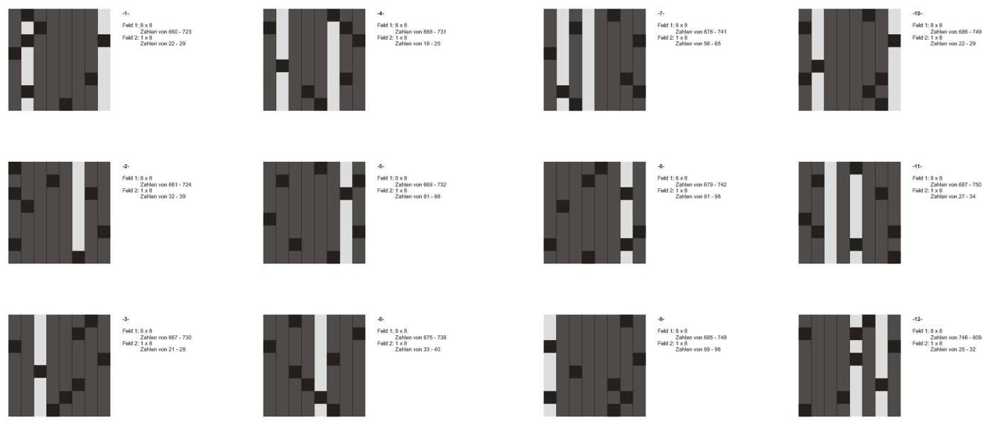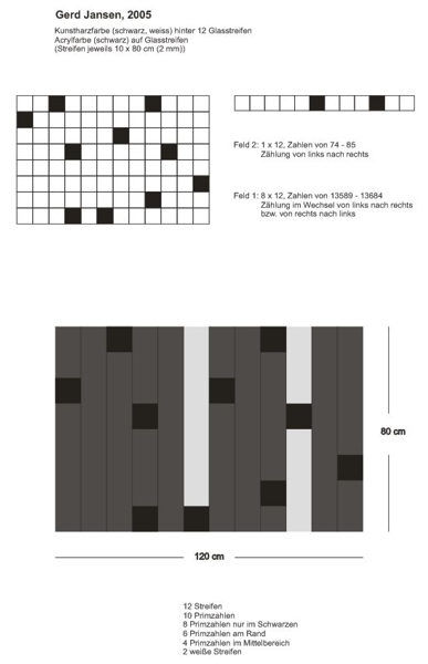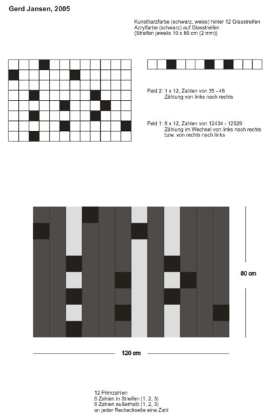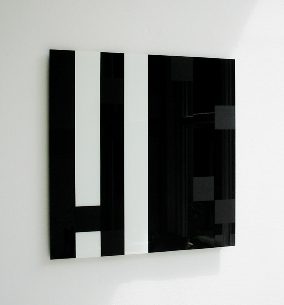 Malerei hinter und auf Glasstreifen (10x80cm), 80 x 80 cm, 12 Arbeiten 2005